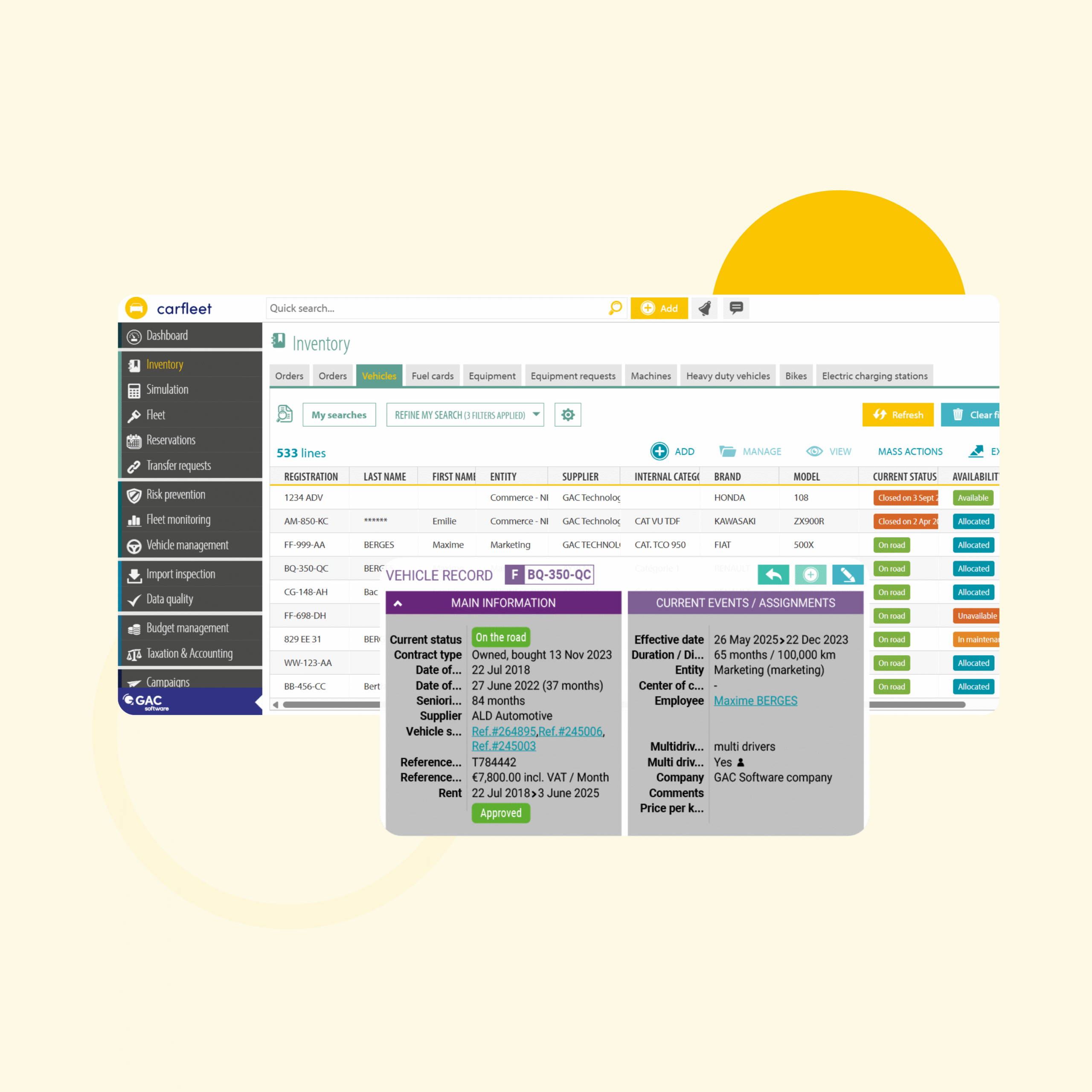 - Enhanced vehicle datasheets: status, type of contract, key dates, registration details, assignment history, etc.