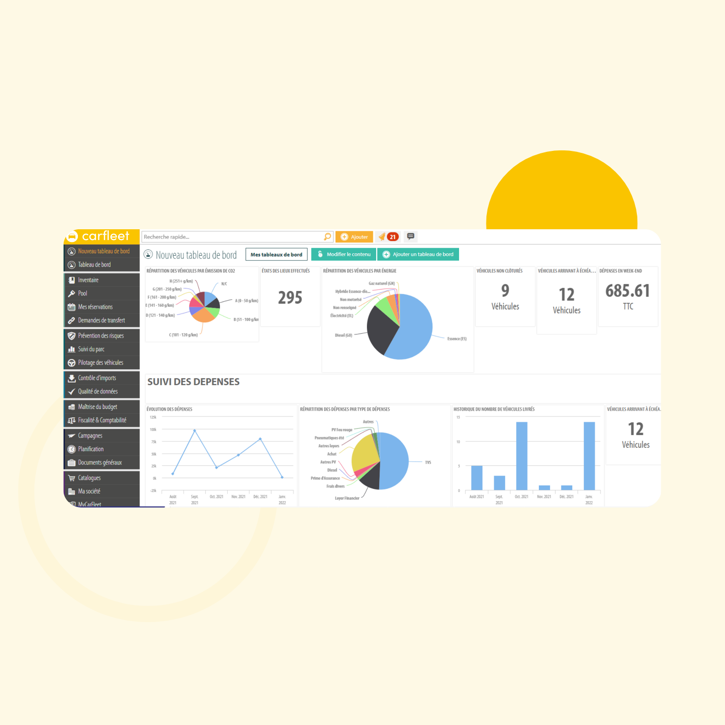 - Indicateurs dynamiques : évolution des coûts, disponibilité des véhicules, alertes à traiter, TCO, PRK…